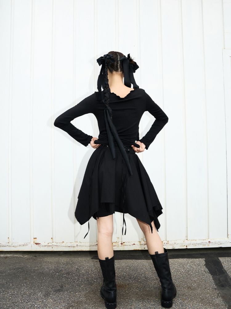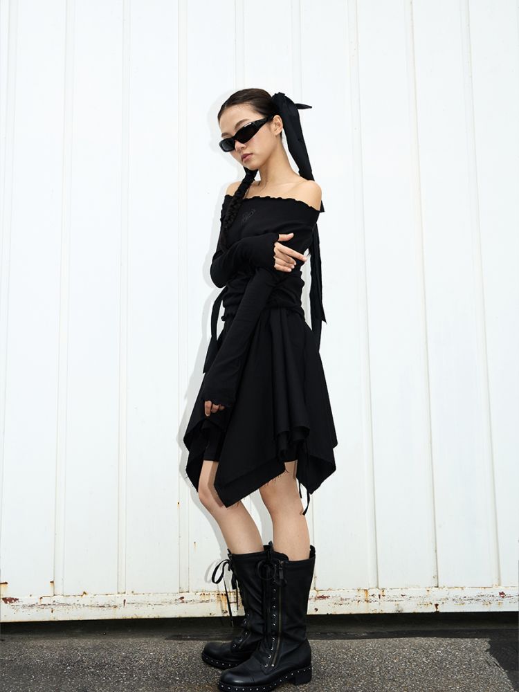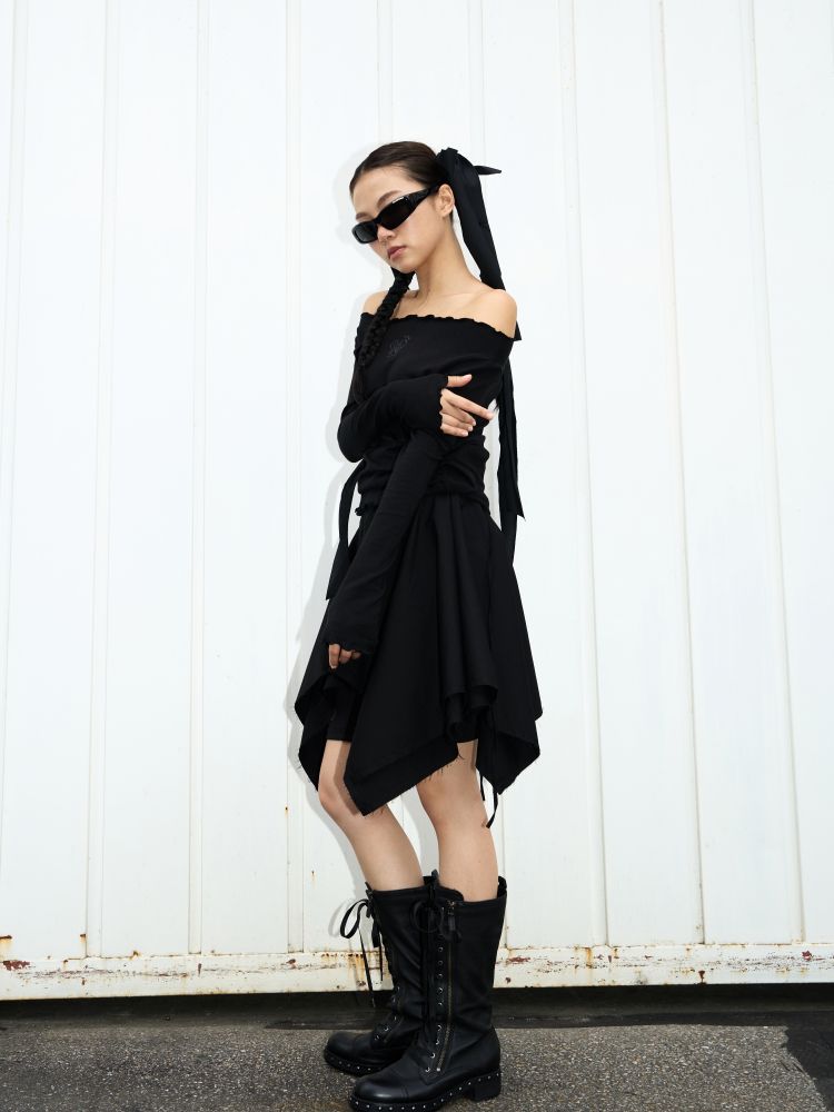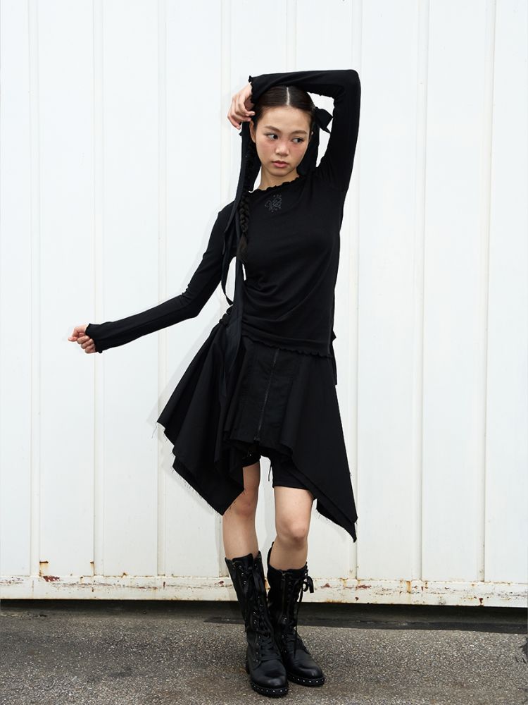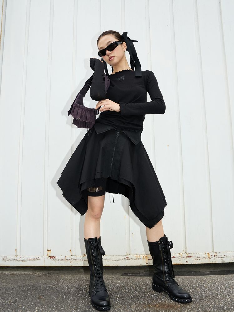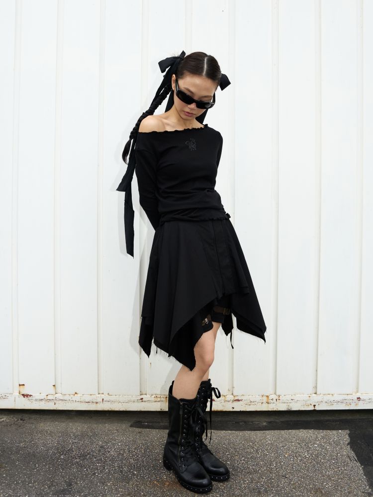 스커트 끝단은 러프한 느낌을 위해 잡사가 자연스럽게 나올 수 있도록 디자인되었습니다.