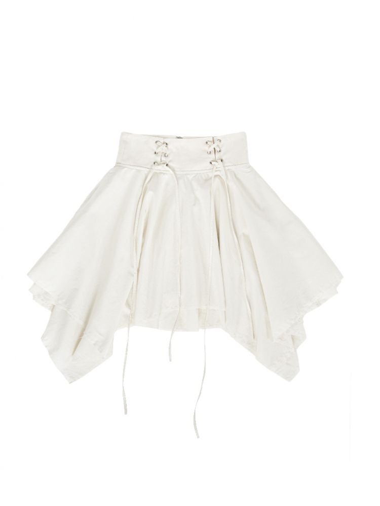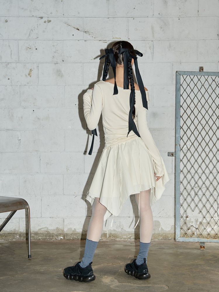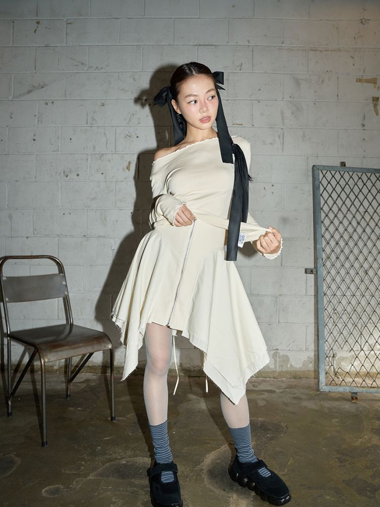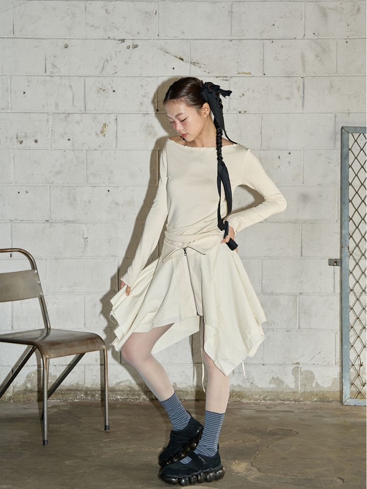 스커트 끝단은 러프한 느낌을 위해 잡사가 자연스럽게 나올 수 있도록 디자인되었습니다.
